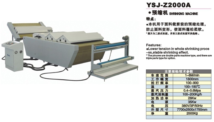 YSJ-Z2000A YSJ预缩机特点:1.本机用于面料裁剪前的预缩处理,防止面料变形,使面料蓬松柔软。产品参数:工作宽度≥1.8m无须配备压缩空气链式导边装置无张力退卷装置包含退卷区域,蒸汽还原区域,定型区域,热定型区域,冷却区域,绕卷区域和摆布区域可调式工作速度1-20米/分震动区域两个震动装置变频控制的直流马达配备抗静电消除器电脑控制温度、速度等参数